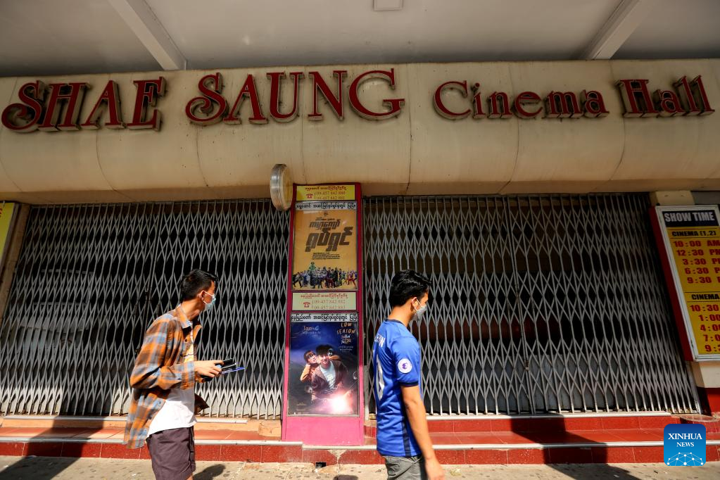 People walk past the shuttered Shae Saung Cinema in downtown Yangon, Myanmar, on March 24, 2022. Myanmar's Ministry of Information has announced to reopen about 60 movie theaters in the country starting on April 17, in accordance with Health Ministry's COVID-19 prevention and control measures. (Xinhua/U Aung)