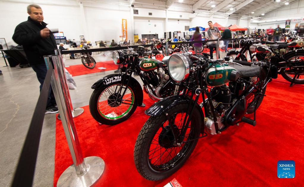 A man looks at a vintage motorcycle during the 2022 North American International Motorcycle Supershow in Mississauga, the Greater Toronto Area, Canada, on March 25, 2022. The three-day event kicked off here on Friday with hundreds of different models of motorcycles. (Photo by Zou Zheng/Xinhua)