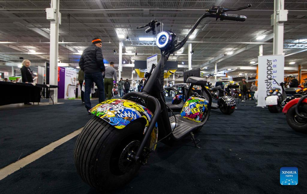 An electric scooter is displayed during the 2022 North American International Motorcycle Supershow in Mississauga, the Greater Toronto Area, Canada, on March 25, 2022. The three-day event kicked off here on Friday with hundreds of different models of motorcycles. (Photo by Zou Zheng/Xinhua)