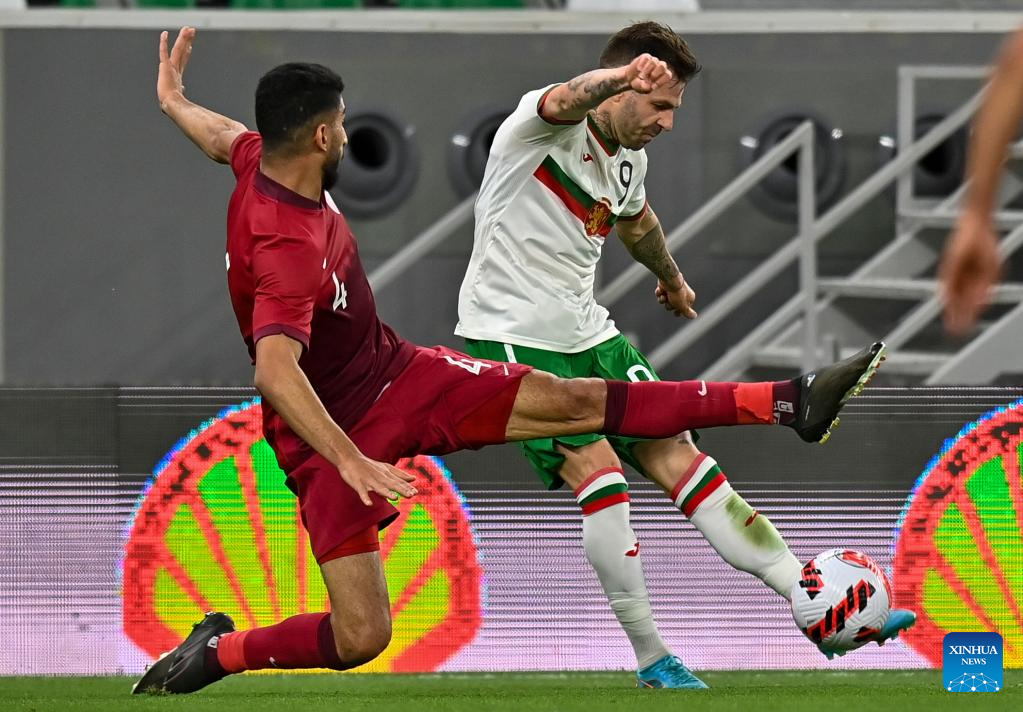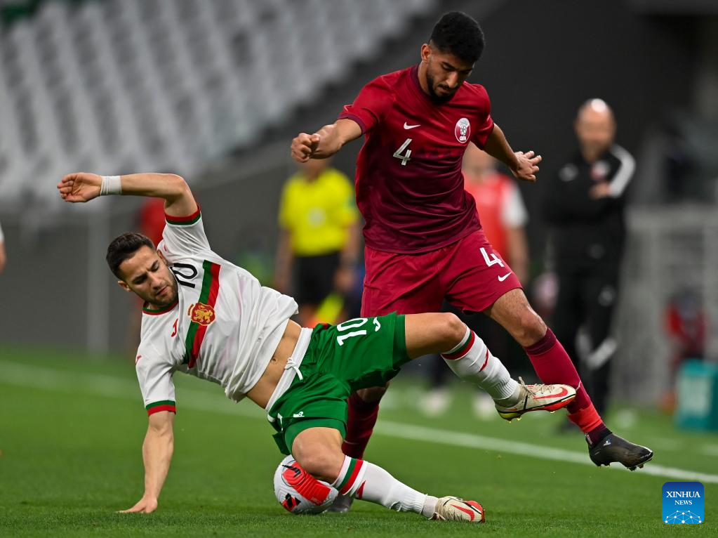 Mohammed Waad Albayati (R) of Qatar vies for the ball with Borislav Aleksandrov Tsonev of Bulgaria during the international friendly match between Qatar and Bulgaria at Education City Stadium in Doha, Qatar, March 26, 2022. (Photo by Nikku/Xinhua)