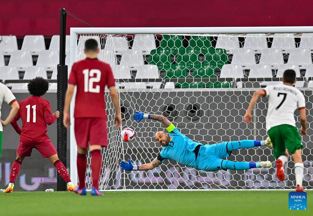 Akram Afif (1st L) of Qatar shoot and scores a penalty kick during the international friendly match between Qatar and Bulgaria at Education City Stadium in Doha, Qatar, March 26, 2022. (Photo by Nikku/Xinhua)