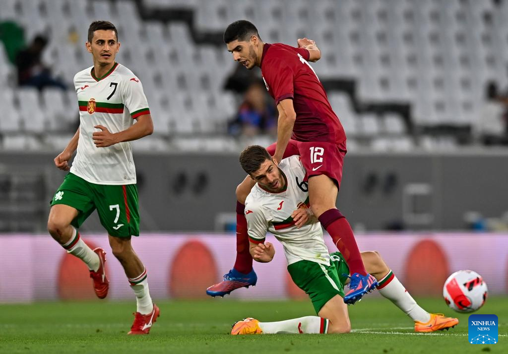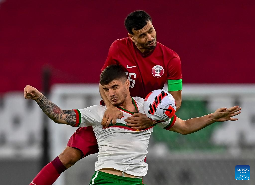 Karim Boudiaf (R top) of Qatar vies for the ball with Petko Hristov of Bulgaria during the international friendly match between Qatar and Bulgaria at Education City Stadium in Doha, Qatar, March 26, 2022. (Photo by Nikku/Xinhua)