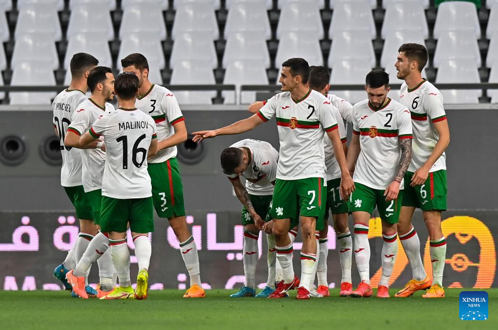 Bulgarian players celebrate after scoring during the international friendly match between Qatar and Bulgaria at Education City Stadium in Doha, Qatar, March 26, 2022. (Photo by Nikku/Xinhua)