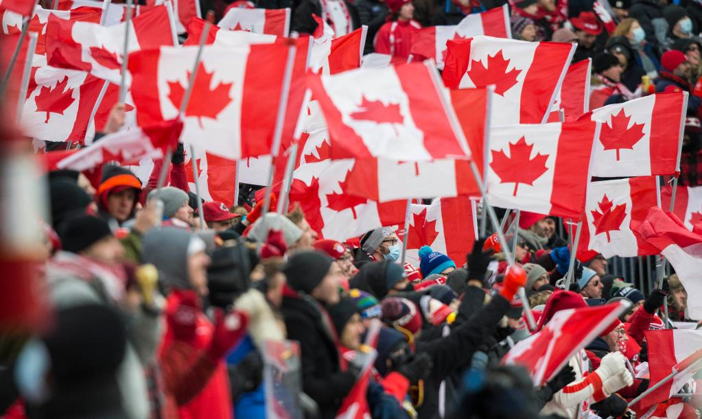 Fans of Canada wave flags during the FIFA World Cup CONCACAF qualifiers match between Canada and Jamaica in Toronto, Canada, on March 27, 2022. (Photo by Zou Zheng/Xinhua)