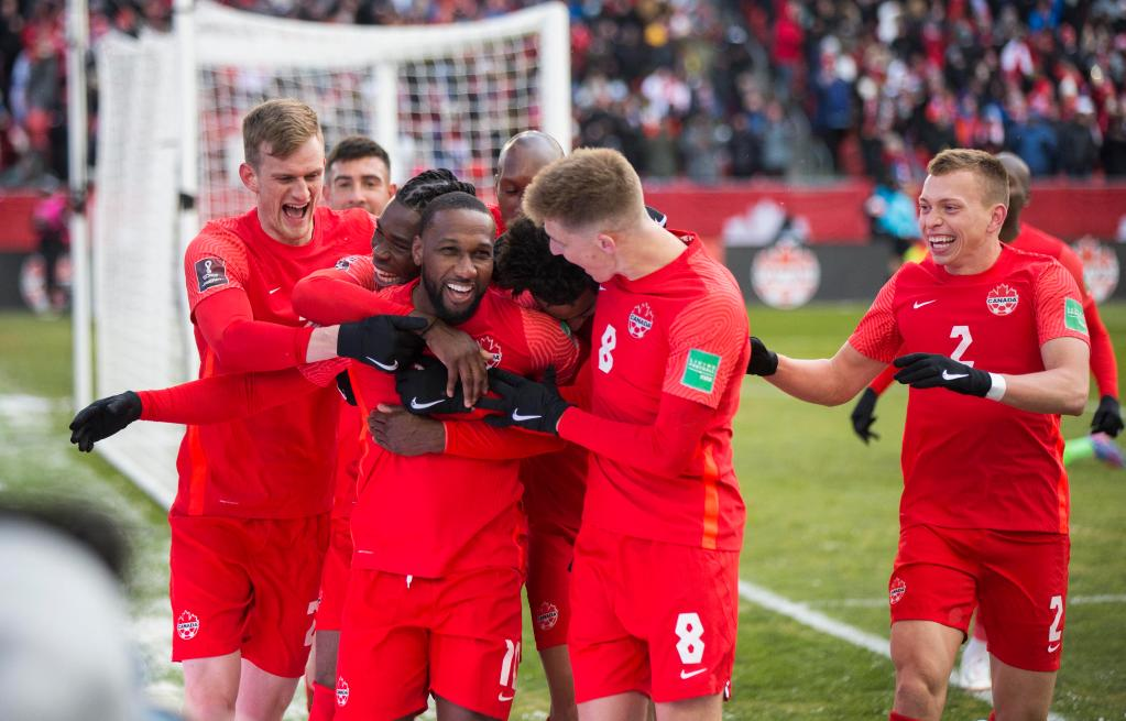 Junior Hoilett (C) of Canada celebrates scoring with teammates during the FIFA World Cup CONCACAF qualifiers match between Canada and Jamaica in Toronto, Canada, on March 27, 2022. (Photo by Zou Zheng/Xinhua)