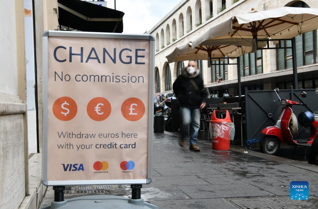 A man walks past an exchange office in Rome, Italy, April 1, 2022. Italy is among the countries hardest hit by the ongoing conflict between Russia and Ukraine, with rising energy prices weighing heavily on the country's post-pandemic economic recovery. This week, the ratings company Standard & Poor's revised the annual growth rate for the Italian economy down from 4.7 percent to 3.1 percent, in the light of the conflict and "the resulting surge in commodity prices." (Xinhua/Jin Mamengni)