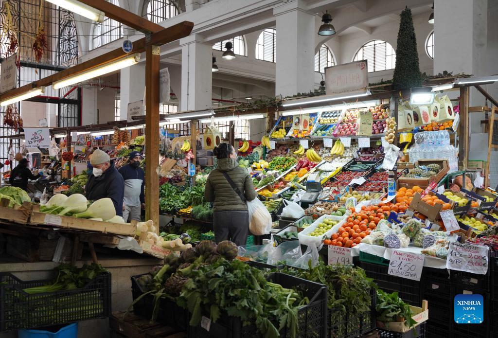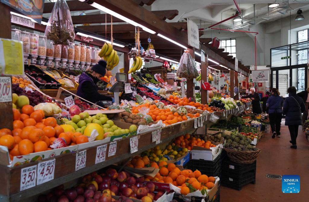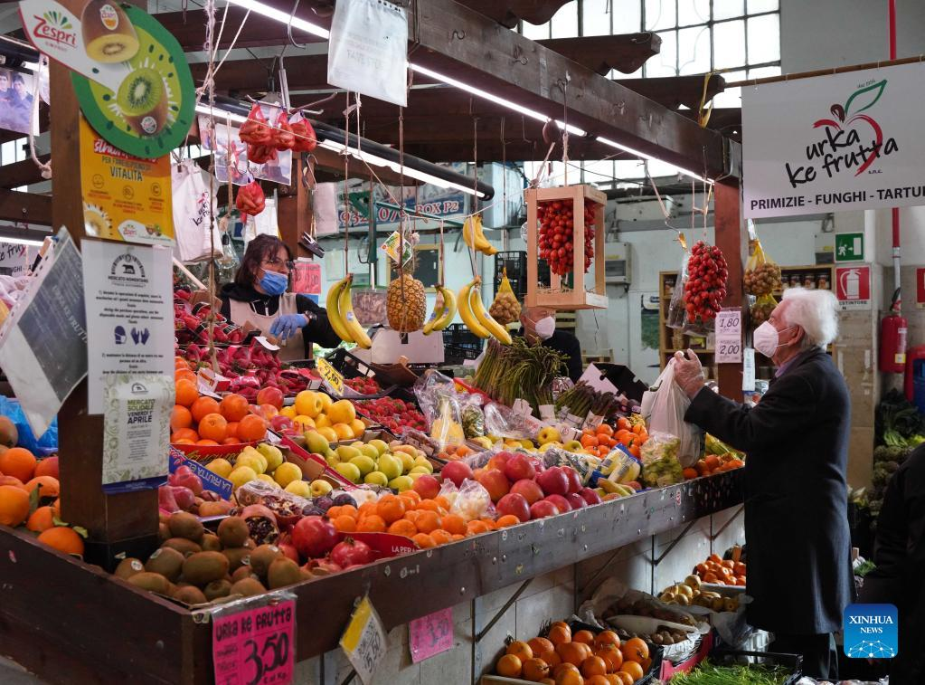 Customers shop at a market in Rome, Italy, April 2, 2022. Italy is among the countries hardest hit by the ongoing conflict between Russia and Ukraine, with rising energy prices weighing heavily on the country's post-pandemic economic recovery. This week, the ratings company Standard & Poor's revised the annual growth rate for the Italian economy down from 4.7 percent to 3.1 percent, in the light of the conflict and "the resulting surge in commodity prices." (Xinhua/Jin Mamengni)