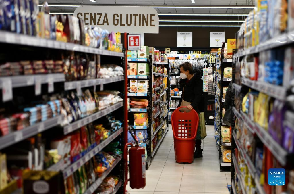 A customer shops at a supermarket in Rome, Italy, April 1, 2022. Italy is among the countries hardest hit by the ongoing conflict between Russia and Ukraine, with rising energy prices weighing heavily on the country's post-pandemic economic recovery. This week, the ratings company Standard & Poor's revised the annual growth rate for the Italian economy down from 4.7 percent to 3.1 percent, in the light of the conflict and "the resulting surge in commodity prices." (Xinhua/Jin Mamengni)