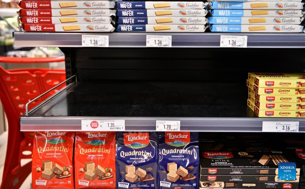 A shelve is seen at a supermarket in Rome, Italy, April 1, 2022. Italy is among the countries hardest hit by the ongoing conflict between Russia and Ukraine, with rising energy prices weighing heavily on the country's post-pandemic economic recovery. This week, the ratings company Standard & Poor's revised the annual growth rate for the Italian economy down from 4.7 percent to 3.1 percent, in the light of the conflict and "the resulting surge in commodity prices." (Xinhua/Jin Mamengni)