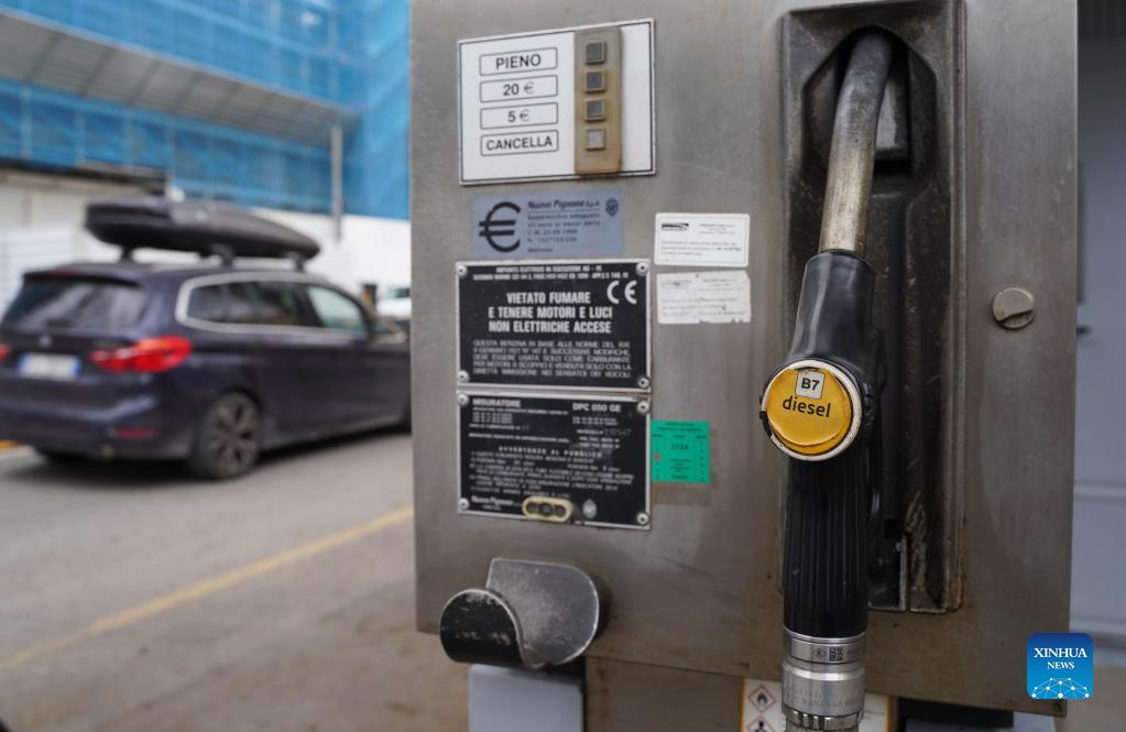 A fuel gun is seen at a self-service gas station in Rome, Italy, April 2, 2022. Italy is among the countries hardest hit by the ongoing conflict between Russia and Ukraine, with rising energy prices weighing heavily on the country's post-pandemic economic recovery. This week, the ratings company Standard & Poor's revised the annual growth rate for the Italian economy down from 4.7 percent to 3.1 percent, in the light of the conflict and "the resulting surge in commodity prices." (Xinhua/Jin Mamengni)