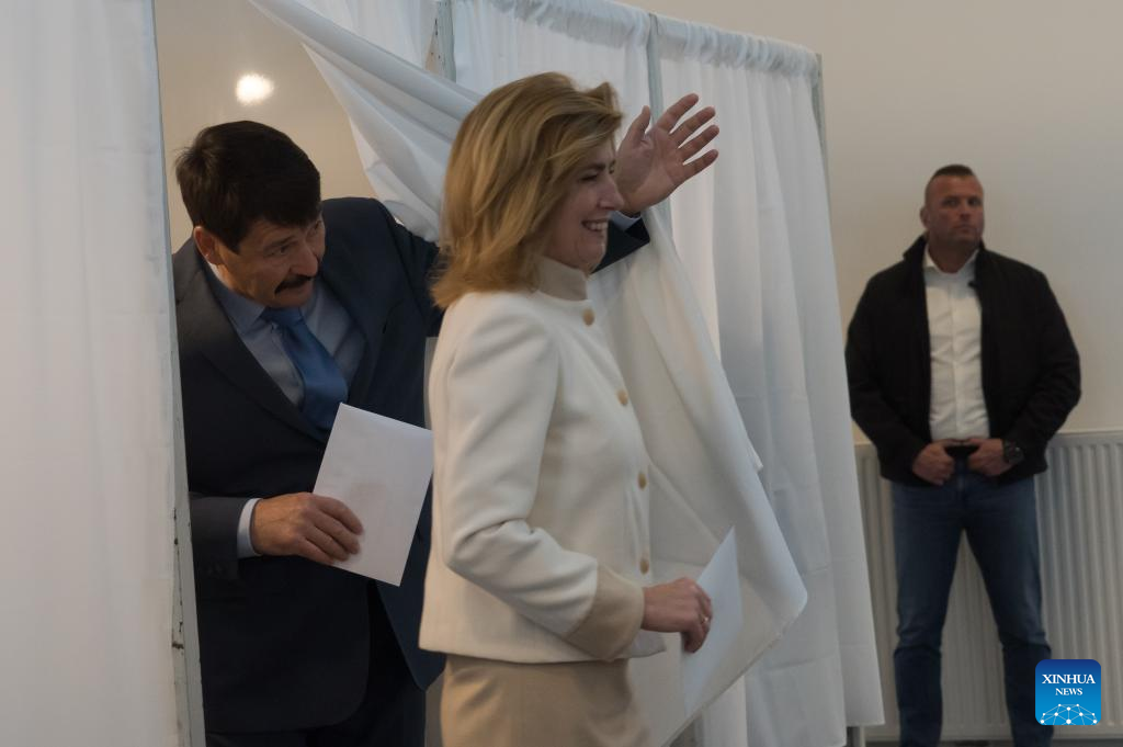 Hungary's President Janos Ader and his wife Anita Herczegh cast their ballots at a polling station in Budapest, Hungary, April 3, 2022.