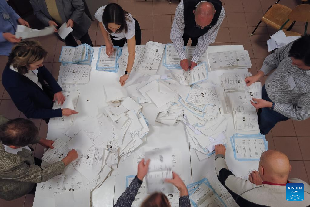 Staff members count ballots at a polling station in Budapest, Hungary, on April 3, 2022. Voters head to the polls in Hungary on Sunday to elect a 199-seat parliament, which could give current Prime Minister Viktor Orban a fourth straight term. (Photo by Attila Volgyi/Xinhua)