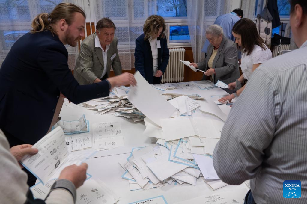 Staff members prepare to count ballots at a polling station in Budapest, Hungary, on April 3, 2022. Voters head to the polls in Hungary on Sunday to elect a 199-seat parliament, which could give current Prime Minister Viktor Orban a fourth straight term. (Photo by Attila Volgyi/Xinhua)