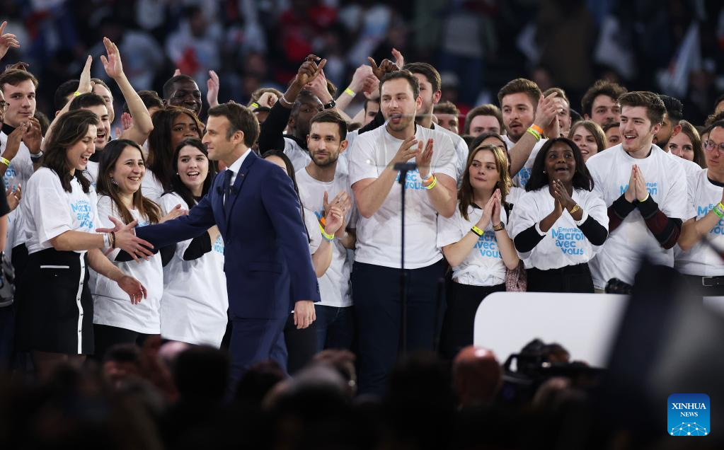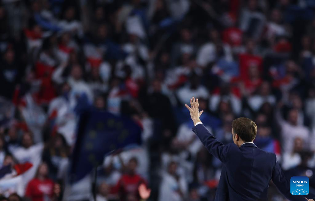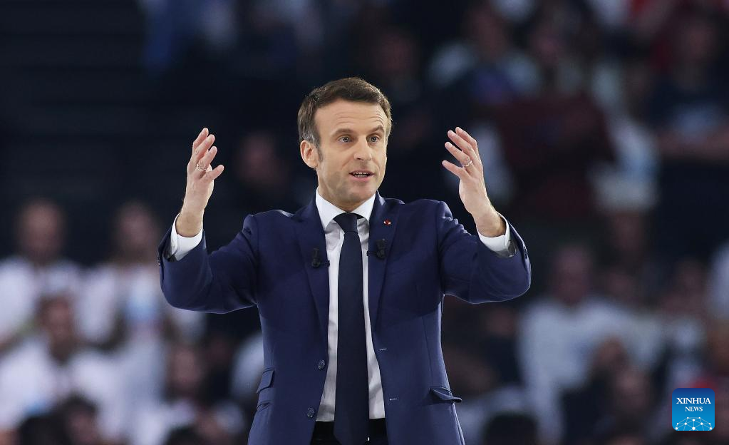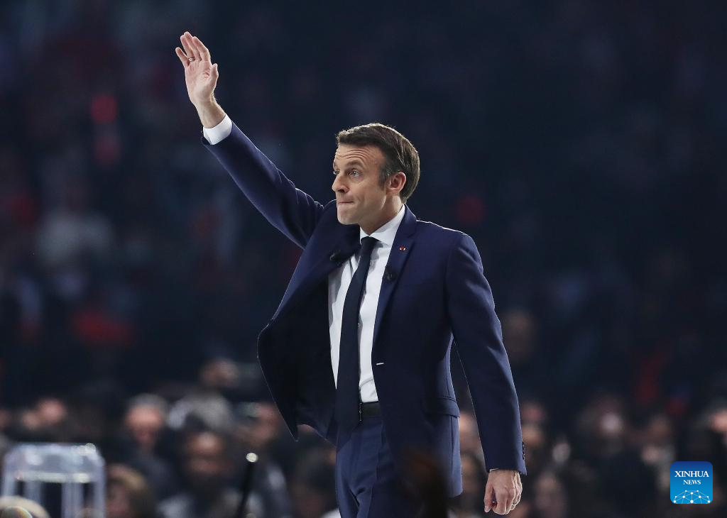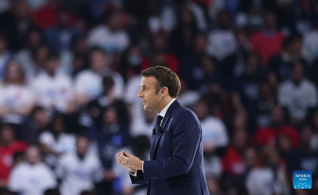 Emmanuel Macron on Saturday held an election rally for his re-election in the upcoming presidential election scheduled for April. (Xinhua/Gao Jing)