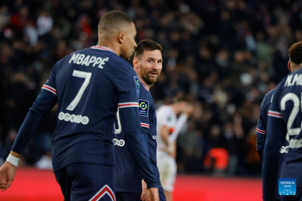 Paris Saint-Germain's Lionel Messi and Kylian Mbappe are seen after a goal during a French Ligue 1 football match between Paris Saint-Germain (PSG) and Lorient in Paris, France, April 3, 2022. (Photo by Rit Heize/Xinhua)