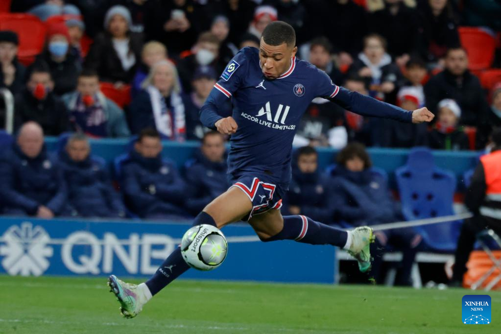 Paris Saint-Germain's Kylian Mbappe competes during a French Ligue 1 football match between Paris Saint-Germain (PSG) and Lorient in Paris, France, April 3, 2022. (Photo by Rit Heize/Xinhua)
