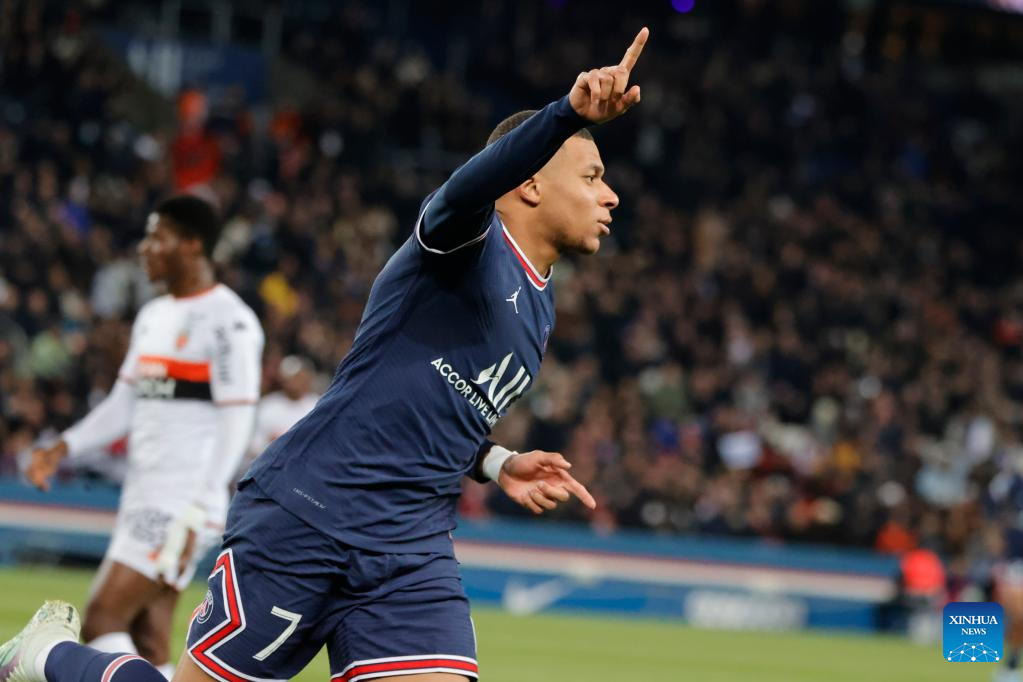 Paris Saint-Germain's Kylian Mbappe celebrates his goal during a French Ligue 1 football match between Paris Saint-Germain (PSG) and Lorient in Paris, France, April 3, 2022. (Photo by Rit Heize/Xinhua)