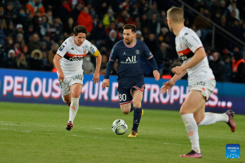 Paris Saint-Germain's Lionel Messi (R) vies with Lorient's Laurent Abergel (L) during a French Ligue 1 football match between Paris Saint-Germain (PSG) and Lorient in Paris, France, April 3, 2022. (Photo by Rit Heize/Xinhua)