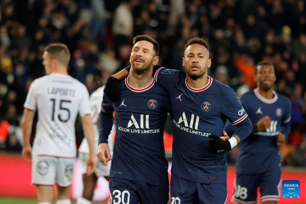 Paris Saint-Germain's Lionel Messi (L) celebrates the goal with Neymar during a French Ligue 1 football match between Paris Saint-Germain (PSG) and Lorient in Paris, France, April 3, 2022. (Photo by Rit Heize/Xinhua)