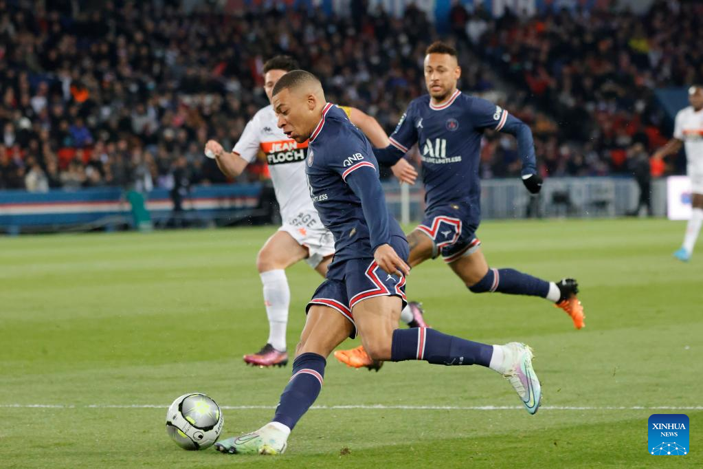 Paris Saint-Germain's Kylian Mbappe (front) competes during a French Ligue 1 football match between Paris Saint-Germain (PSG) and Lorient in Paris, France, April 3, 2022. (Photo by Rit Heize/Xinhua)