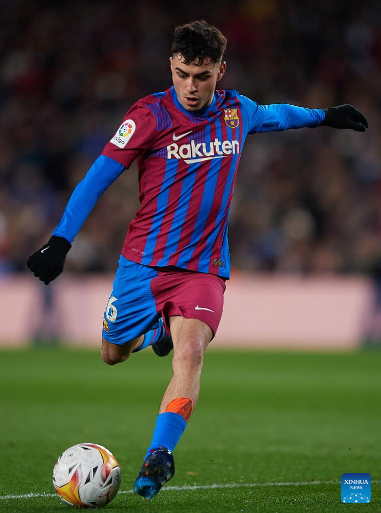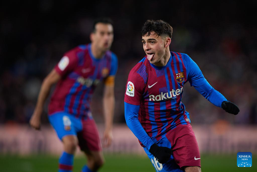 Barcelona's Pedri celebrates his goal during a La Liga Santander match between FC Barcelona and Sevilla FC in Camp Nou, Barcelona, Spain, on April 3, 2022. (Photo by Pablo Morano/Xinhua)