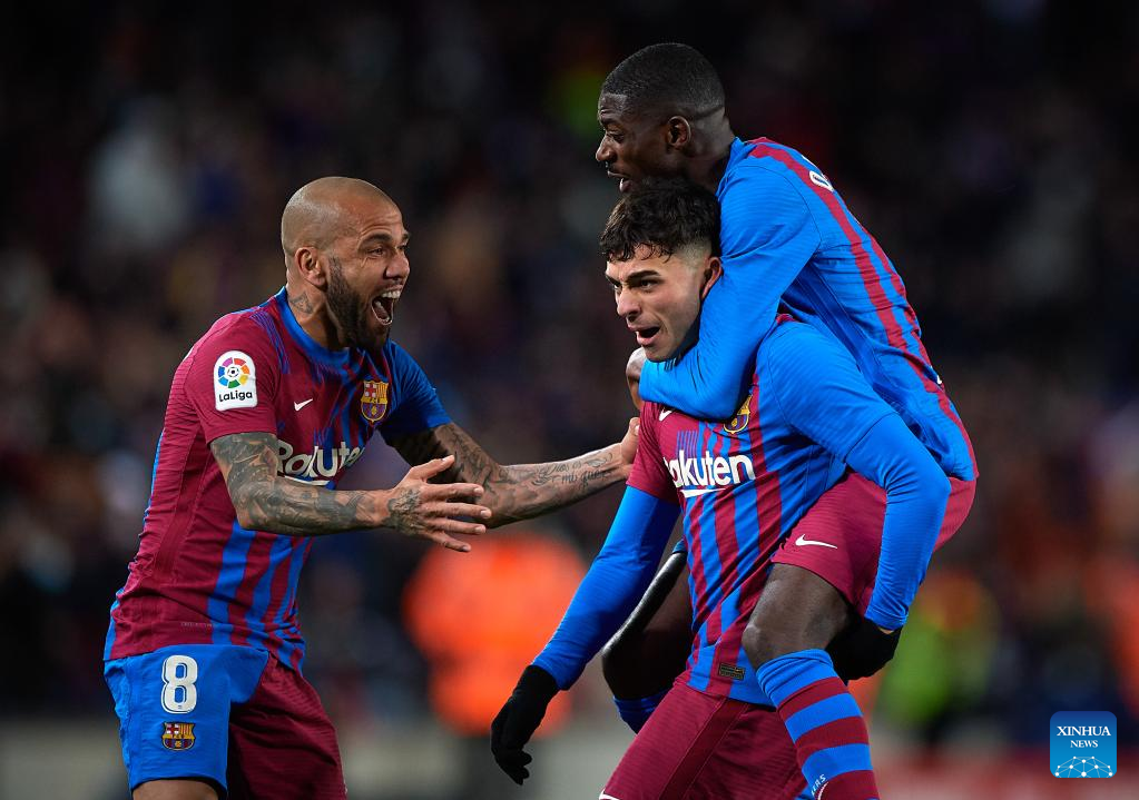 Barcelona's Pedri (2nd L) celebrates his goal with teammates during a La Liga Santander match between FC Barcelona and Sevilla FC in Camp Nou, Barcelona, Spain, on April 3, 2022. (Photo by Pablo Morano/Xinhua)