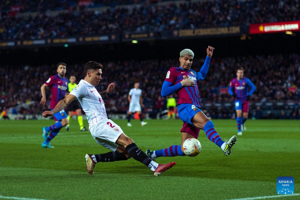 Barcelona's Ronald Araujo (R) vies with Sevilla's Gonzalo Montiel during a La Liga Santander match between FC Barcelona and Sevilla FC in Camp Nou, Barcelona, Spain, on April 3, 2022. (Photo by Joan Gosa/Xinhua)
