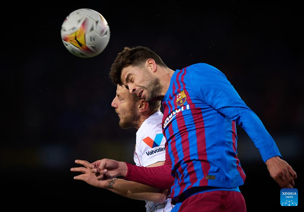 Barcelona's Gerard Pique (R) vies with Sevilla's Ivan Rakitic during a La Liga Santander match between FC Barcelona and Sevilla FC in Camp Nou, Barcelona, Spain, on April 3, 2022. (Photo by Pablo Morano/Xinhua)