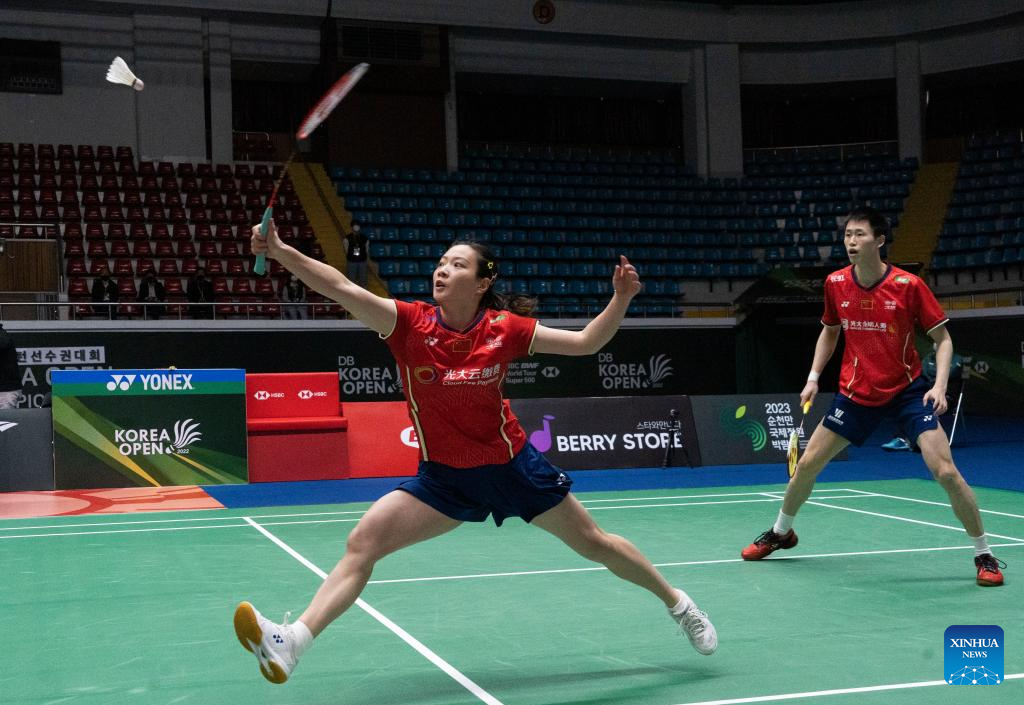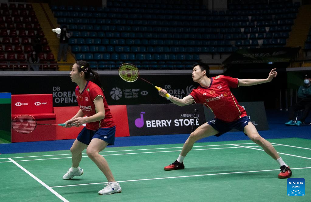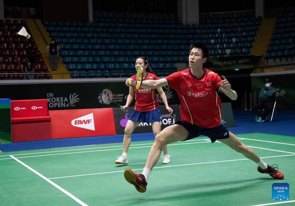 Ou Xuanyi/Huang Yaqiong (L) of China compete during the mixed doubles quarterfinals match against Tan Kian Meng/Lai Pei Jing of Malaysia at the BWF Korea Open Badminton Championships 2022 in Suncheon, South Korea, April 8, 2022. (Photo by James Lee/Xinhua) (Photo by James Lee/Xinhua)