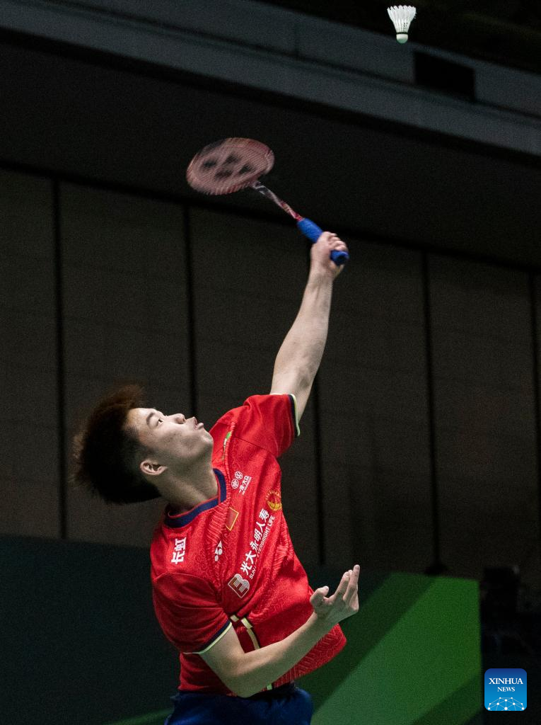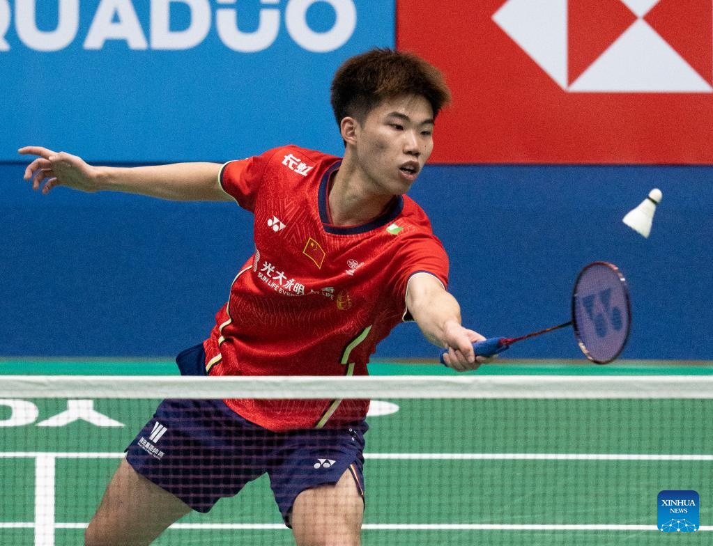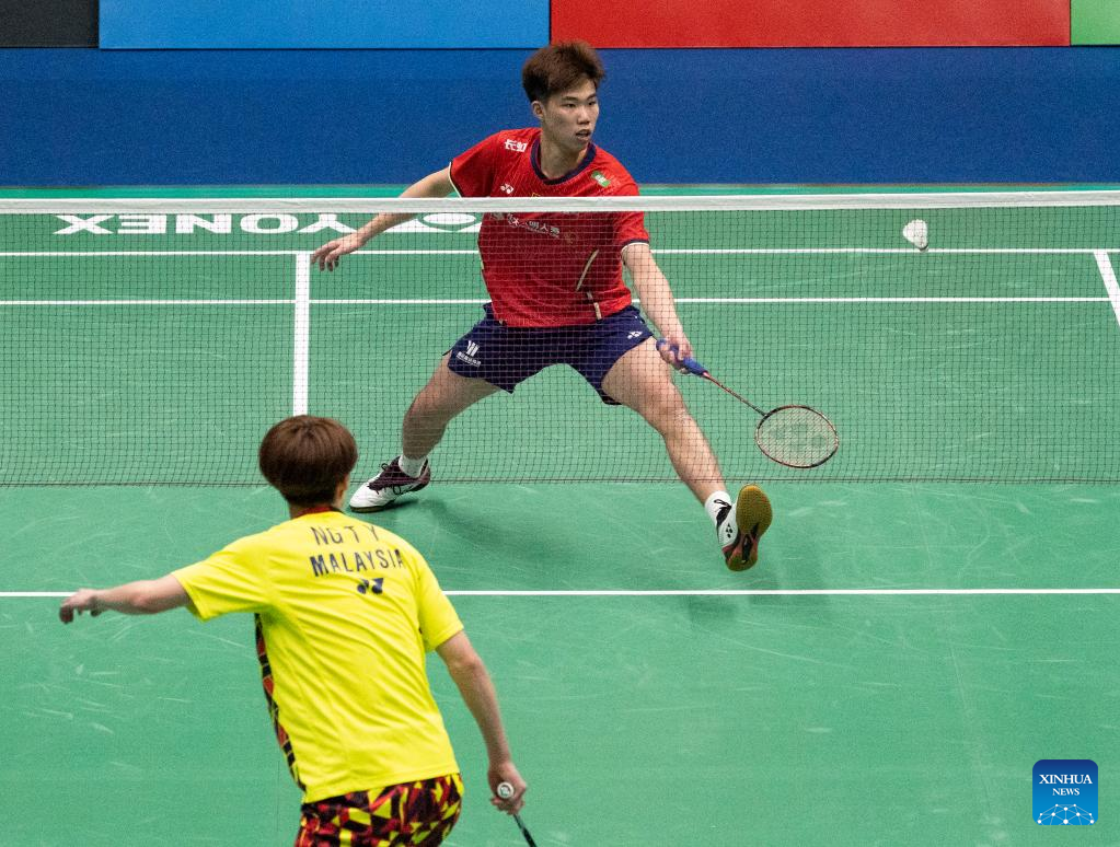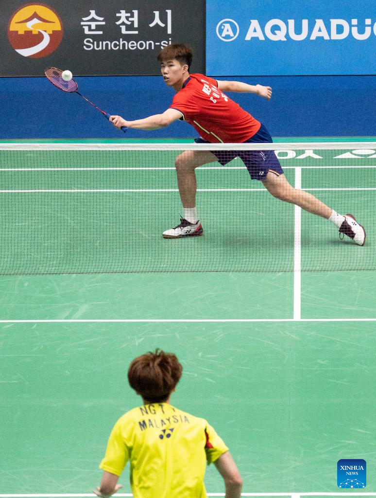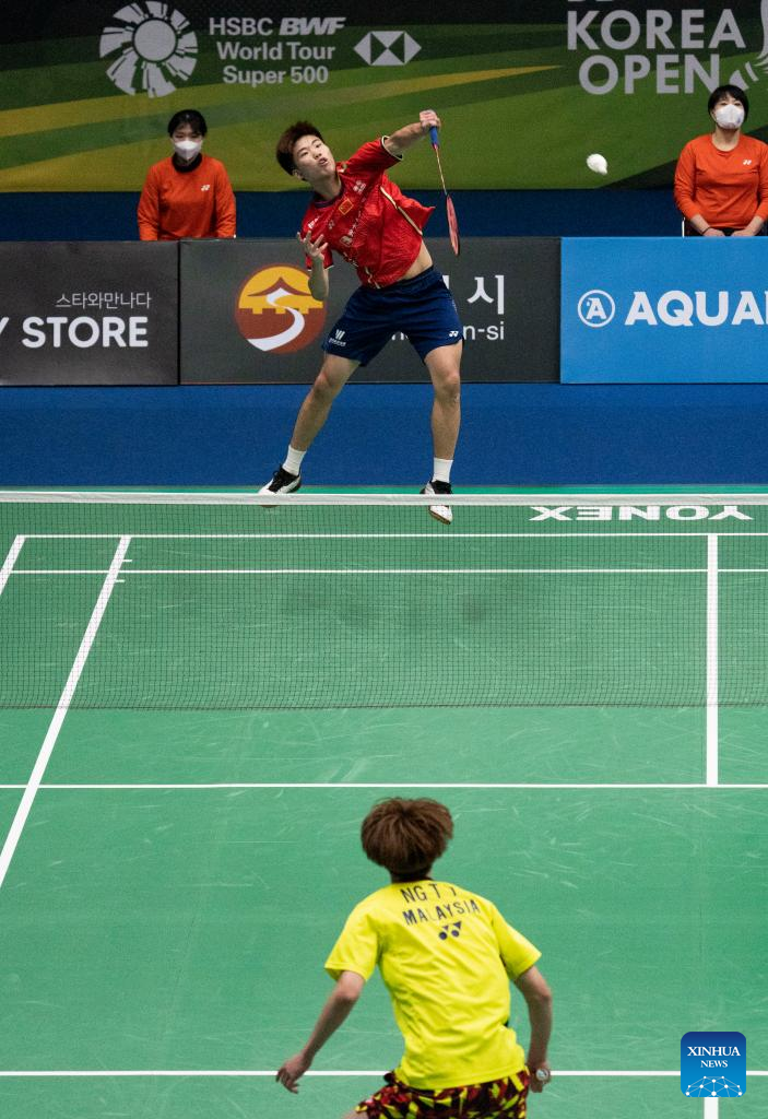 Weng Hongyang of China hits a return during the men's singles quarterfinals match against Ng Tze Yong of Malaysia at the BWF Korea Open Badminton Championships 2022 in Suncheon, South Korea, April 8, 2022. (Photo by James Lee/Xinhua)