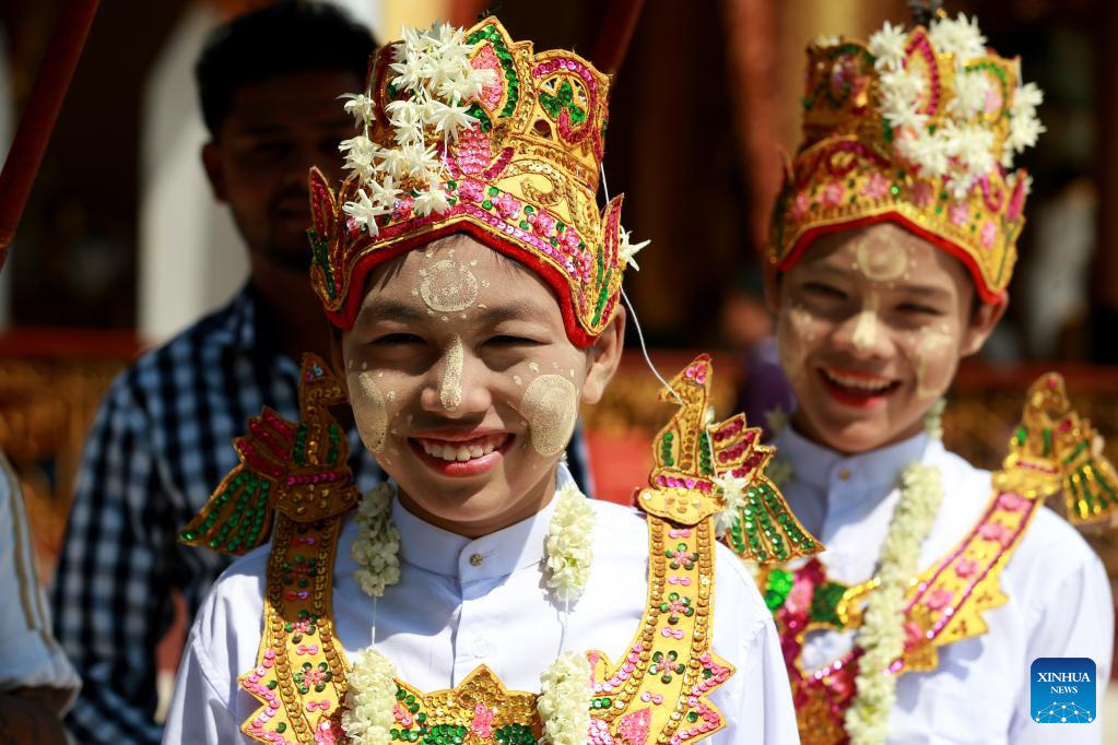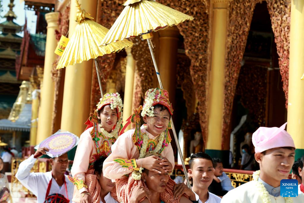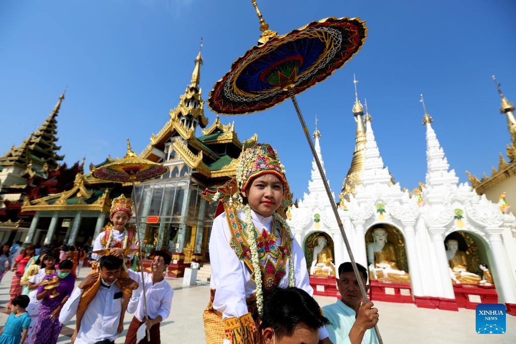 Boys in traditional attire attend the Shinbyu novitiation ceremony at Shwedagon Pagoda in Yangon, Myanmar, April 10, 2022. The Shinbyu novitiation ceremony is an essential part in a life of a male Myanmar Buddhist under the age of 20. (Xinhua/U Aung)