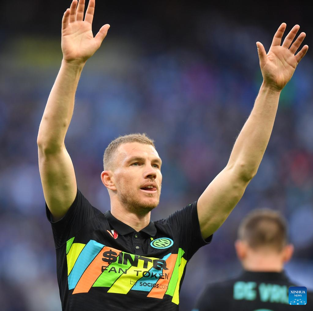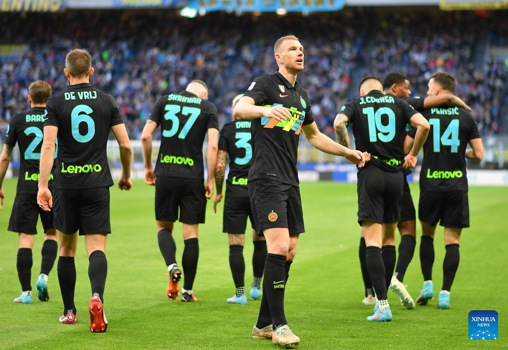 FC Inter's Eden Dzeko celebrates his goal during a Serie A football match between FC Inter and Hellas Verona in Milan, Italy, April 9, 2022. (Str/Xinhua)