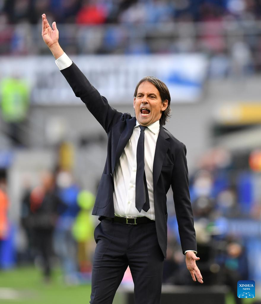 FC Inter's head coach Simone Inzaghi reacts during a Serie A football match between FC Inter and Hellas Verona in Milan, Italy, April 9, 2022. (Str/Xinhua)