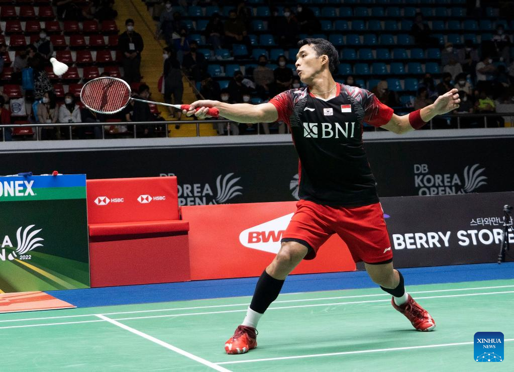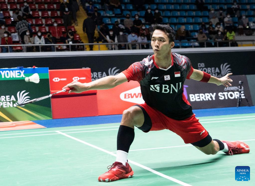 Jonatan Christie of Indonesia hits a return during the men's singles final match against Weng Hongyang of China at the BWF Korea Open Badminton Championships 2022 in Suncheon, South Korea, April 10, 2022. (Photo by James Lee/Xinhua)