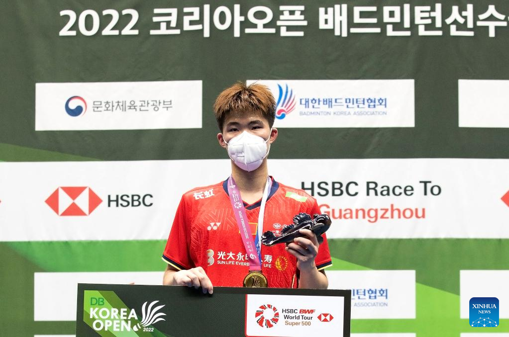 Weng Hongyang of China attends the awarding ceremony after winning the men's singles final match against Jonatan Christie of Indonesia at the BWF Korea Open Badminton Championships 2022 in Suncheon, South Korea, April 10, 2022. (Photo by James Lee/Xinhua)