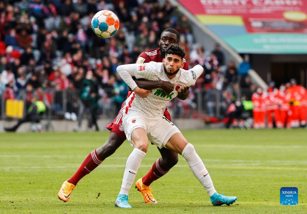 Dayot Upamecano (up) of Bayern Munich vies with Ricardo Pepi of Augsburg during a German Bundesliga match between Bayern Munich and FC Augsburg in Munich, Germany, April 9, 2022. (Photo by Philippe Ruiz/Xinhua)