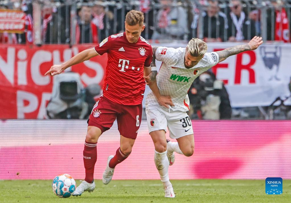 Joshua Kimmich (L) of Bayern Munich vies with Niklas Dorsch of Augsburg during a German Bundesliga match between Bayern Munich and FC Augsburg in Munich, Germany, April 9, 2022. (Photo by Philippe Ruiz/Xinhua)