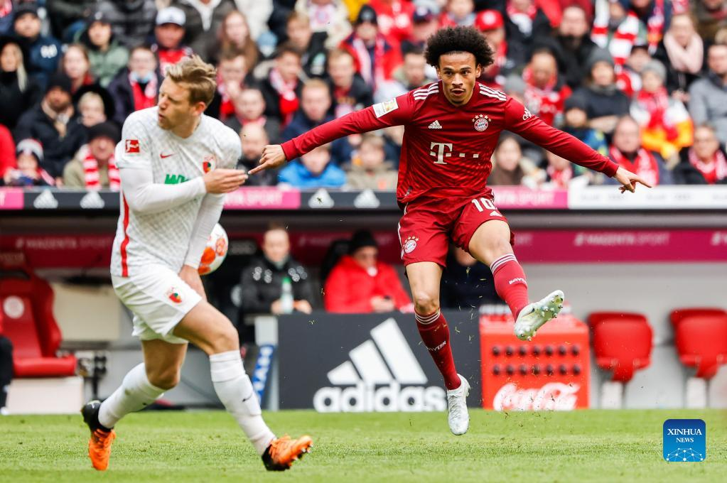 Leroy Sane (R) of Bayern Munich takes a shot during a German Bundesliga match between Bayern Munich and FC Augsburg in Munich, Germany, April 9, 2022. (Photo by Philippe Ruiz/Xinhua)