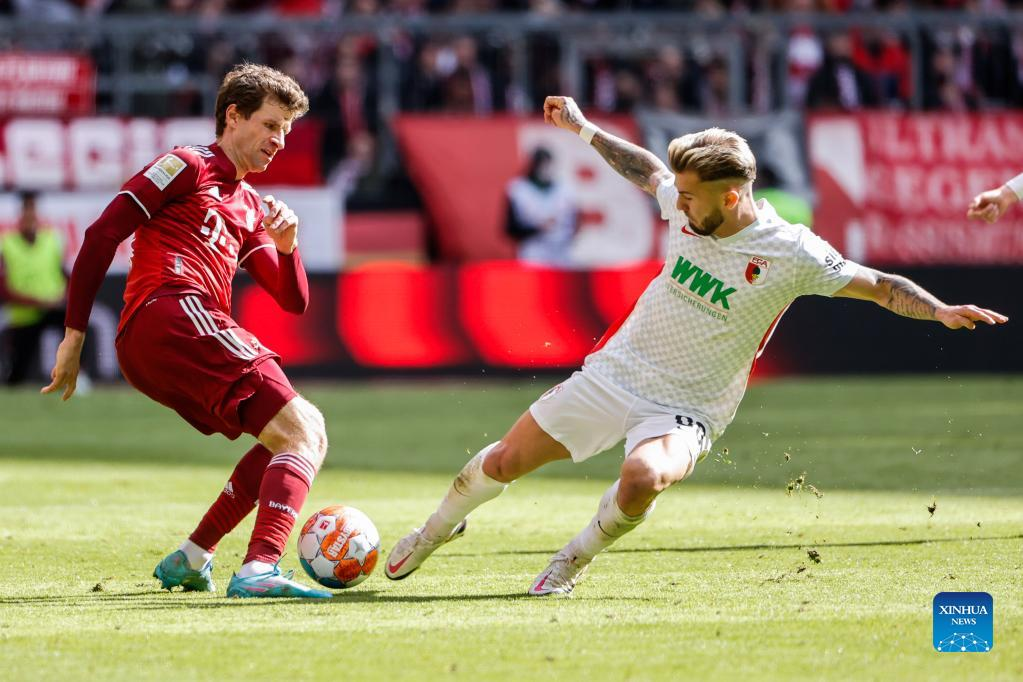 Thomas Mueller (L) of Bayern Munich vies with Niklas Dorsch of Augsburg during a German Bundesliga match between Bayern Munich and FC Augsburg in Munich, Germany, April 9, 2022. (Photo by Philippe Ruiz/Xinhua)
