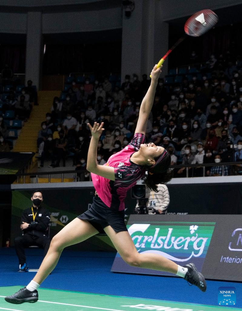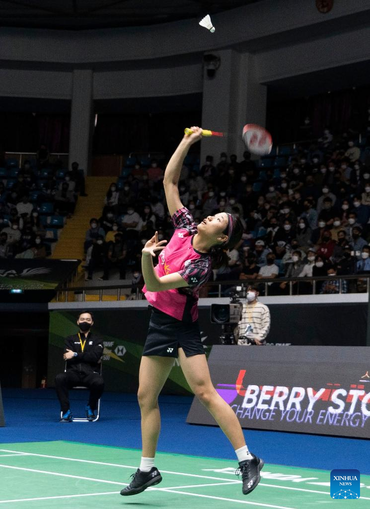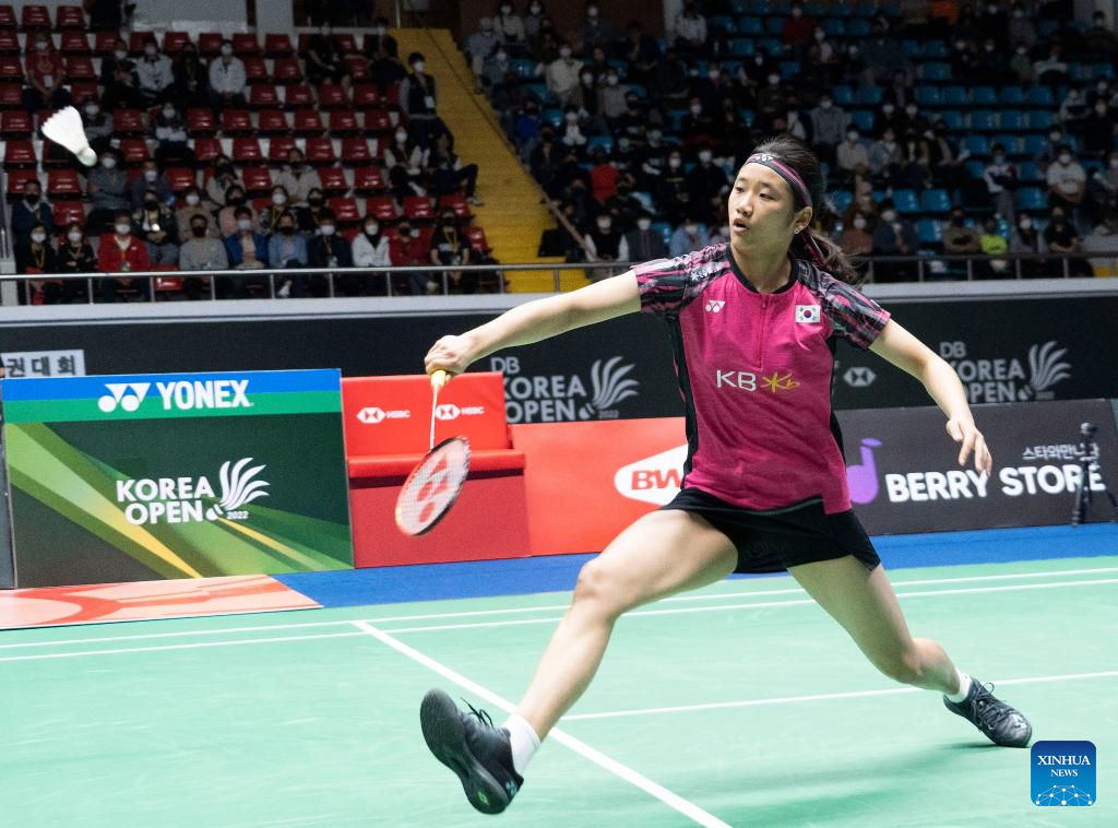 An Seyoung of South Korea hits a return during the women's singles final match against Pornpawee Chochuwong of Thailand at the BWF Korea Open Badminton Championships 2022 in Suncheon, South Korea, April 10, 2022. (Photo by James Lee/Xinhua)