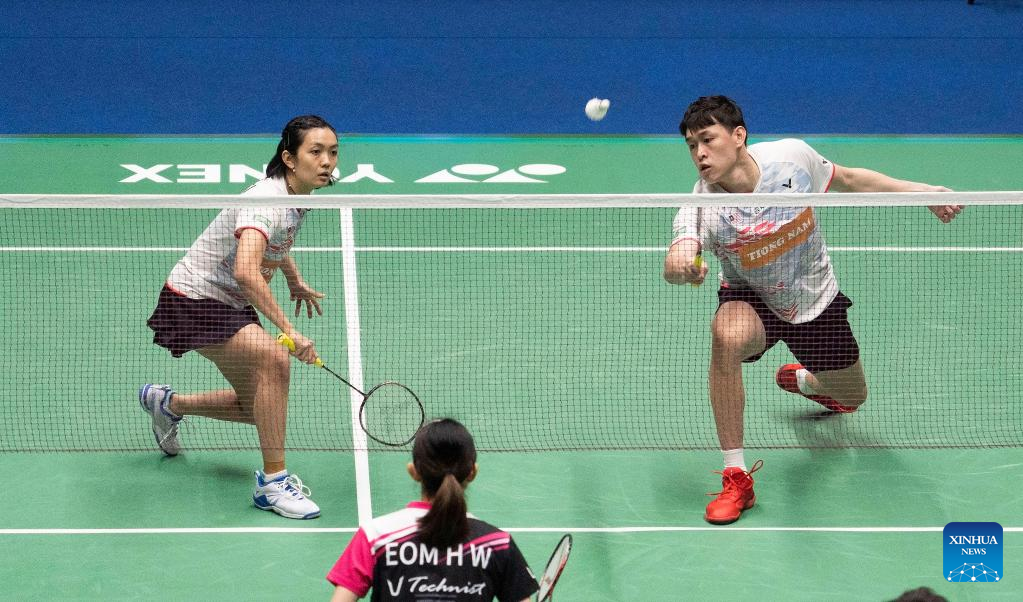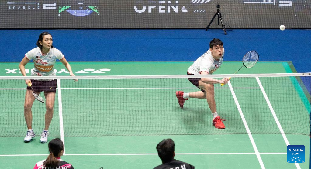 Tan Kian Meng (R)/Lai Pei Jing of Malaysia compete during the mixed doubles final match against Ko Sung-hyun/Eom Hye-won of South Korea at the BWF Korea Open Badminton Championships 2022 in Suncheon, South Korea, April 10, 2022. (Photo by James Lee/Xinhua)