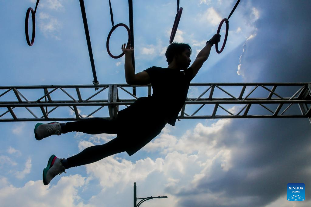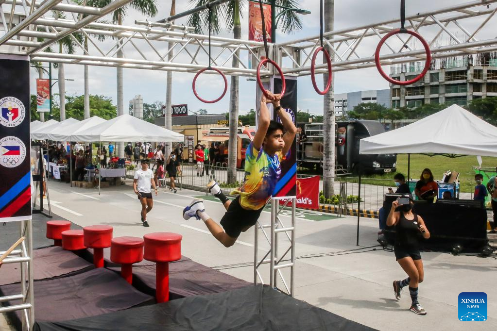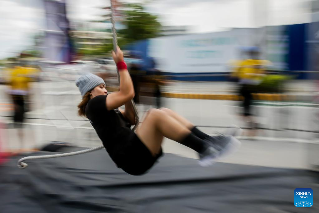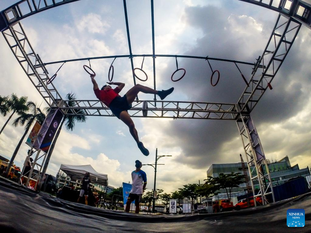 A contestant participates in the Philippine Obstacle Course Racing 100m (OCR 100m) competition in Pasig City, the Philippines on April 9, 2022. (Photo by Rouelle Umali/Xinhua)