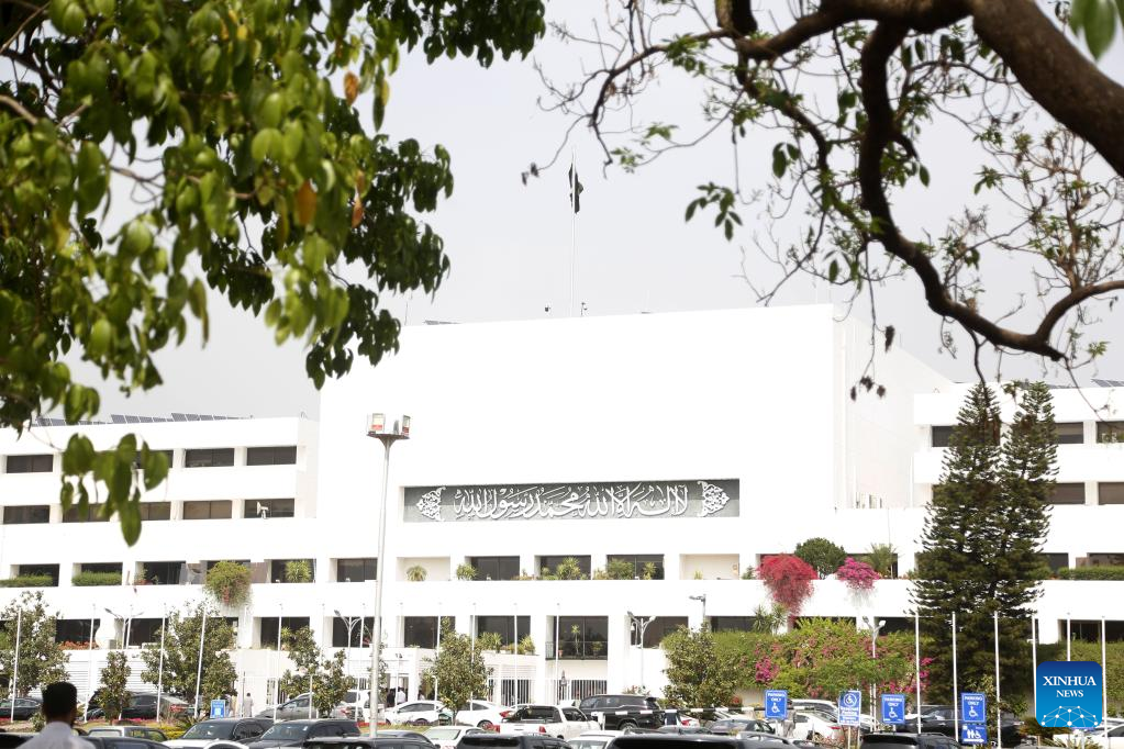 Photo taken on April 11, 2022 shows the National Assembly building where the session to choose the new prime minister continues in Islamabad, capital of Pakistan. The opposition's joint candidate Shahbaz Sharif was elected as the 23rd Prime Minister of Pakistan on Monday, said Sardar Ayaz Sadiq, who chaired the National Assembly session to conduct the election for the country's new prime minister. (Xinhua/Ahmad Kamal)