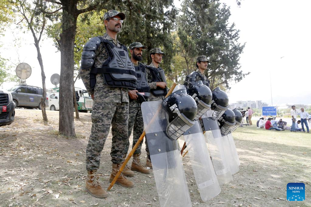 Security personnel stand guard outside the National Assembly building where the session to choose the new prime minister continues in Islamabad, capital of Pakistan on April 11, 2022. The opposition's joint candidate Shahbaz Sharif was elected as the 23rd Prime Minister of Pakistan on Monday, said Sardar Ayaz Sadiq, who chaired the National Assembly session to conduct the election for the country's new prime minister. (Xinhua/Ahmad Kamal)
