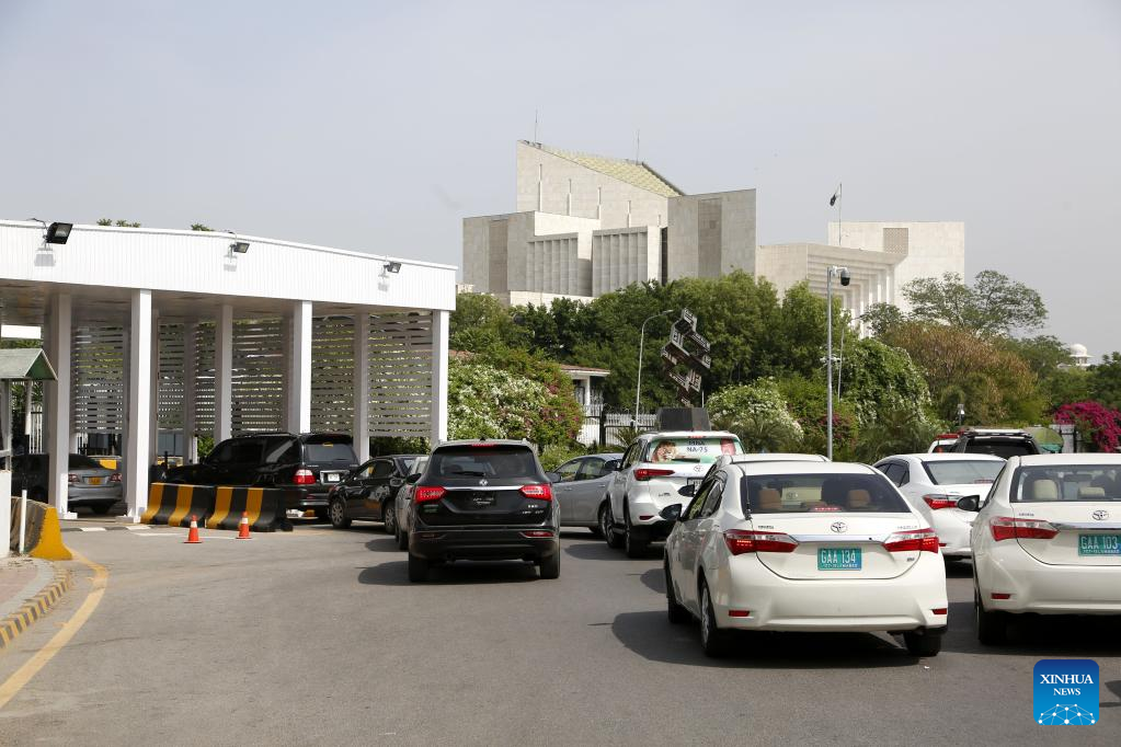 Vehicles carrying lawmakers arrive to attend the National Assembly session in Islamabad, capital of Pakistan on April 11, 2022. The opposition's joint candidate Shahbaz Sharif was elected as the 23rd Prime Minister of Pakistan on Monday, said Sardar Ayaz Sadiq, who chaired the National Assembly session to conduct the election for the country's new prime minister. (Xinhua/Ahmad Kamal)