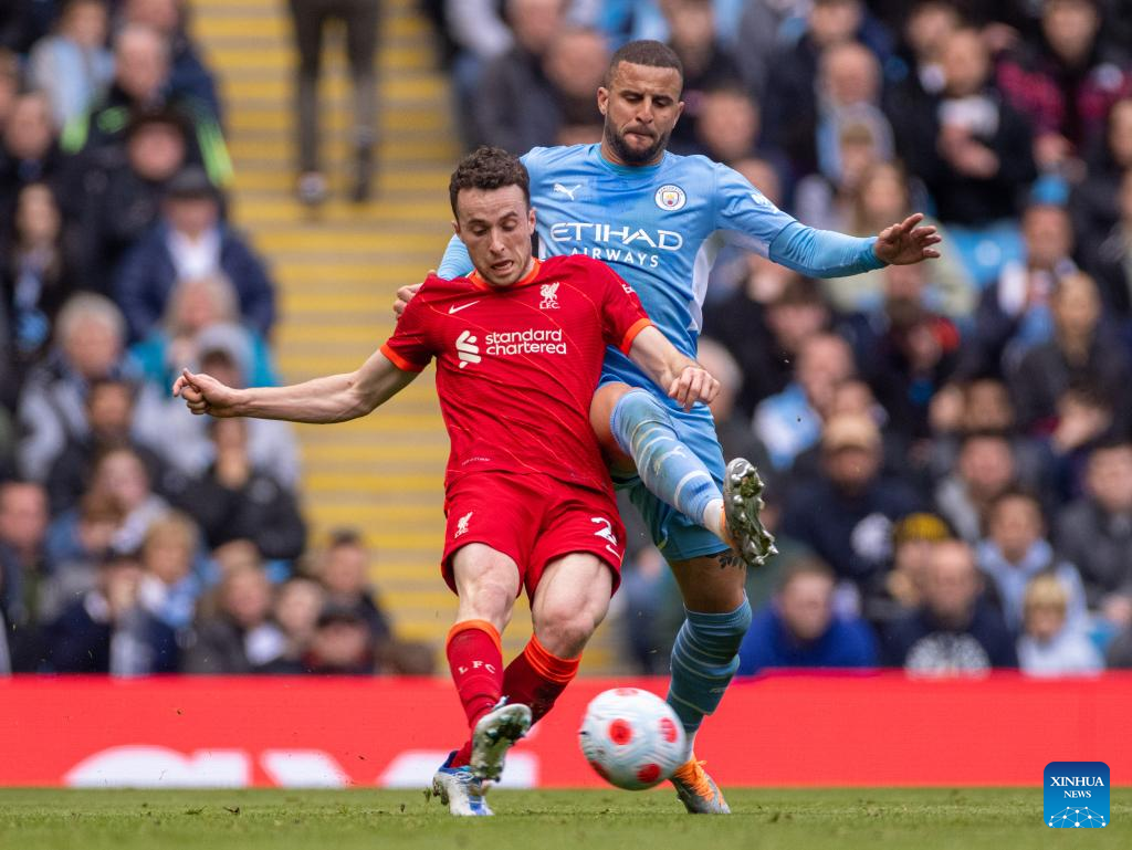 Liverpool's Diogo Jota (L) is challenged by Manchester City's Kyle Walker during the English Premier League match between Manchester City and Liverpool in Manchester, Britain, on April 10, 2022. The game ended in a 2-2 draw. (Xinhua)