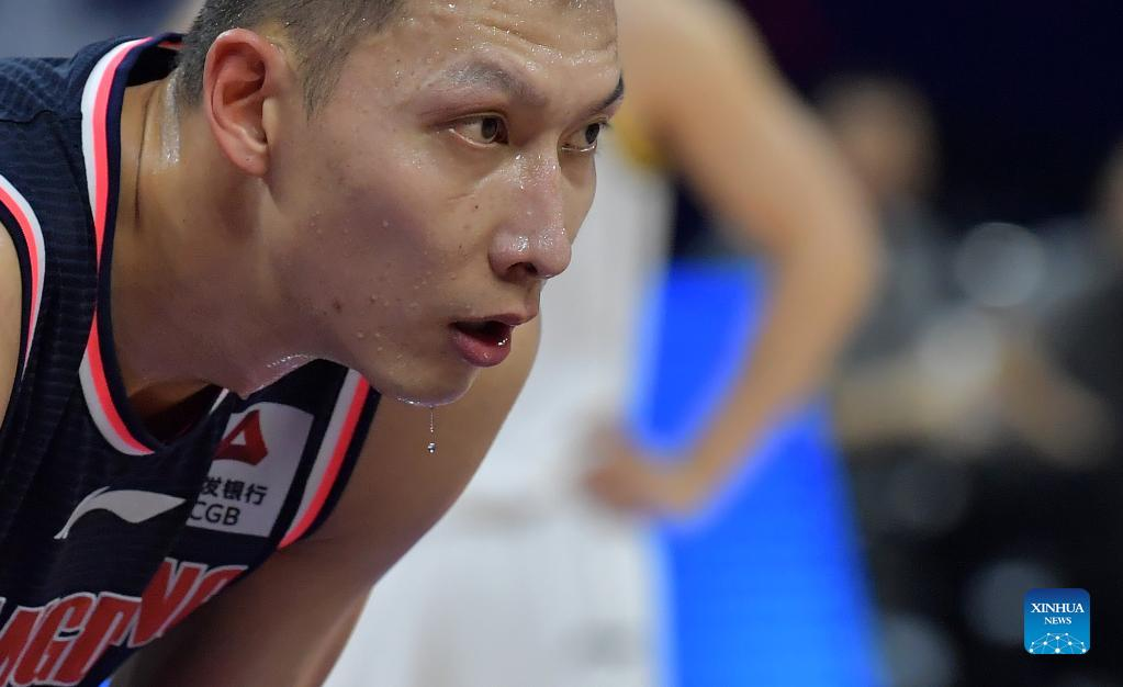 Yi Jianlian of Guangdong Southern Tigers reacts during the semifinal between Guangdong Southern Tigers and Liaoning Flying Leopards at the 2021-2022 season of the Chinese Basketball Association (CBA) league in Nanchang, east China's Jiangxi Province, April 12, 2022. (Xinhua/Peng Zhaozhi)