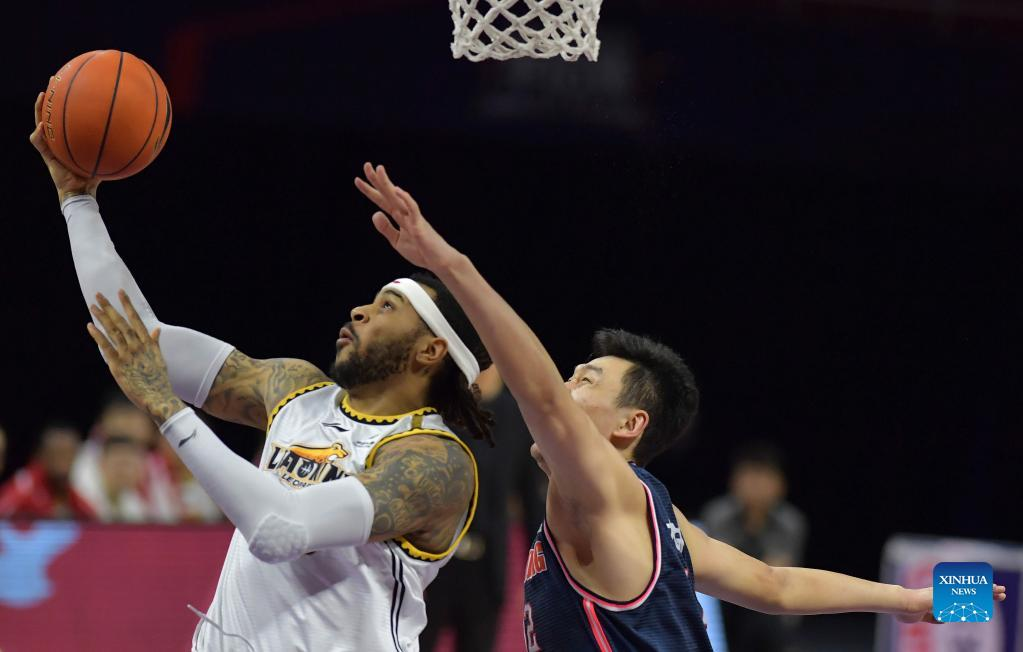 Eric Moreland (R) of Liaoning Flying Leopards competes during the semifinal between Guangdong Southern Tigers and Liaoning Flying Leopards at the 2021-2022 season of the Chinese Basketball Association (CBA) league in Nanchang, east China's Jiangxi Province, April 12, 2022. (Xinhua/Peng Zhaozhi)