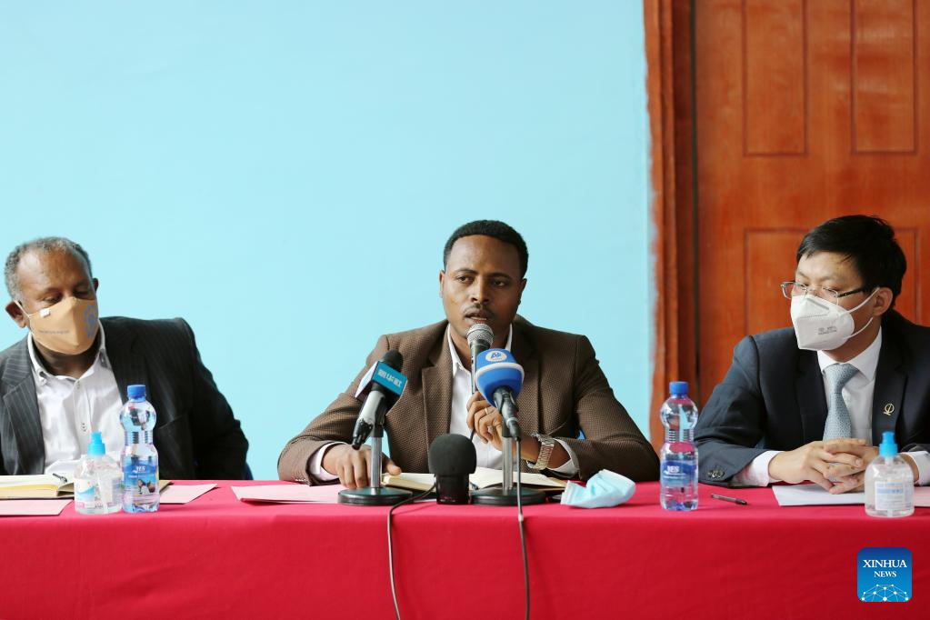 Admasu Dechasa (C), deputy head of Addis Ababa Education Bureau, speaks at a donation ceremony in Ethiopia's capital Addis Ababa on April 9, 2022.(Xinhua/Wang Ping)