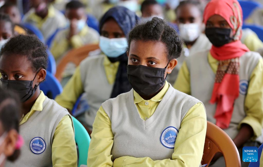 Students of Kotari Primary School attend a donation ceremony in Ethiopia's capital Addis Ababa on April 9, 2022.(Xinhua/Wang Ping)
